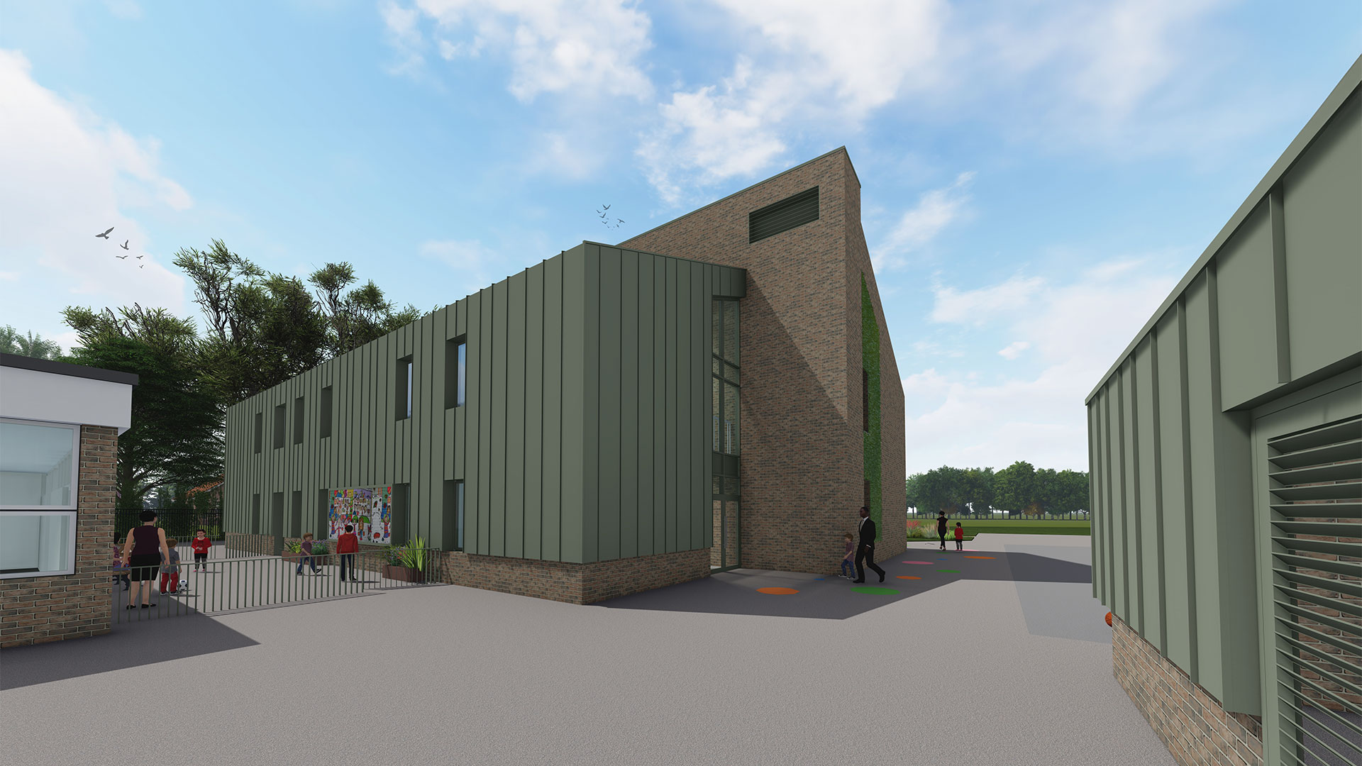 Classrooms are oriented towards the playing field to maximise views and daylight, with toilets and storage facing the existing main building. A full-length corridor links the two volumes and accommodates the main entrances and stairs, while the functional division is expressed externally through contrasting materials: brick to the classroom block and standing seam zinc to the secondary volume. Designed to meet the Council’s carbon neutrality ambitions and target BREEAM Excellent, the project will also unlock new hard play space and an official-size netball court following removal of the temporary modules.