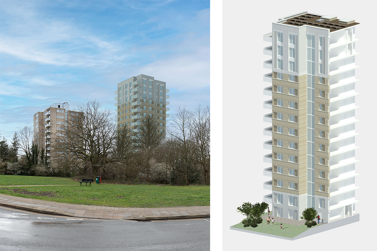 The community centre is to be relocated on the estate enabling the new fourteen storey block to be positioned around the existing heating plant room and closely replicate the spacing of the existing point blocks on the estate.