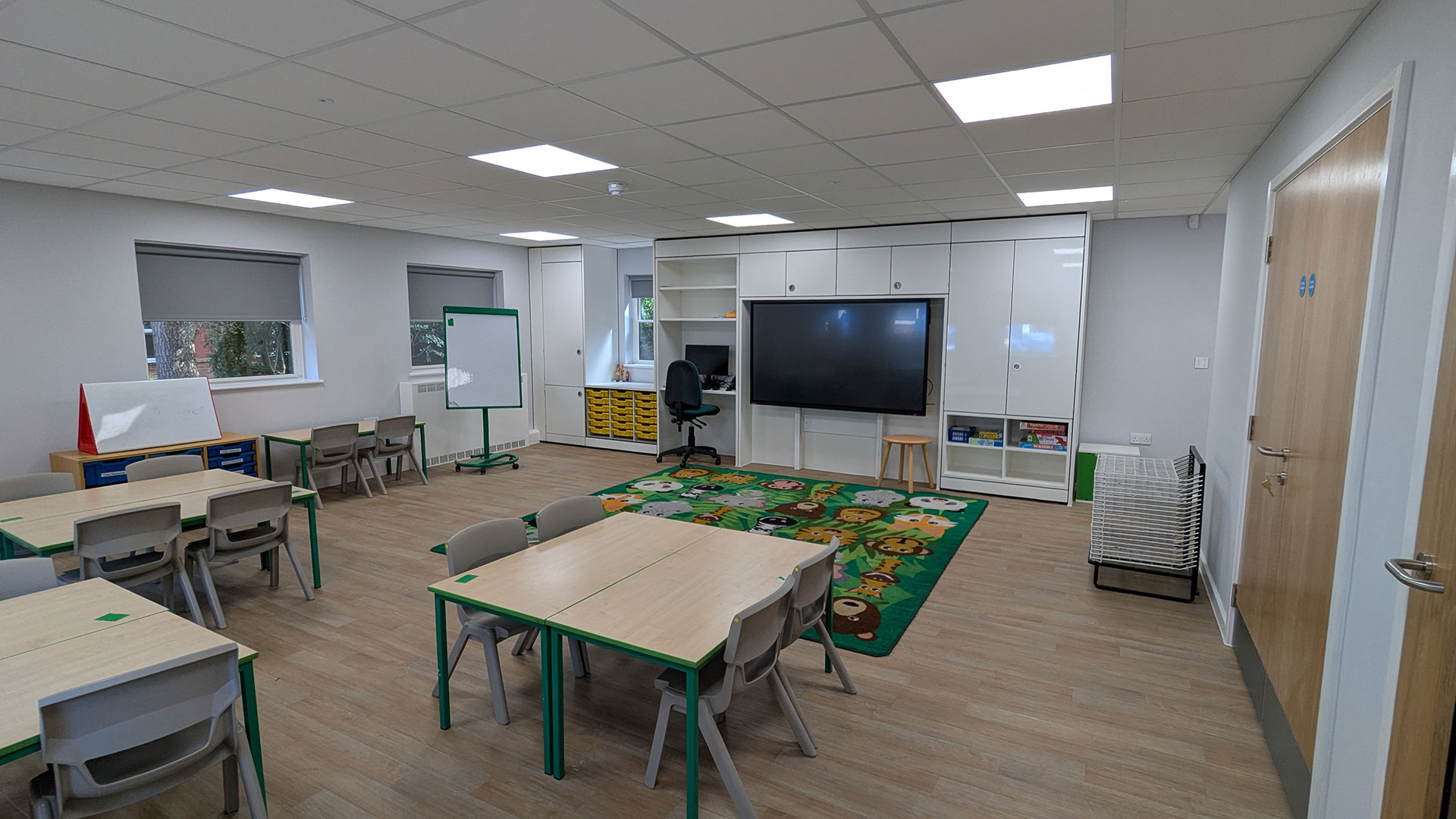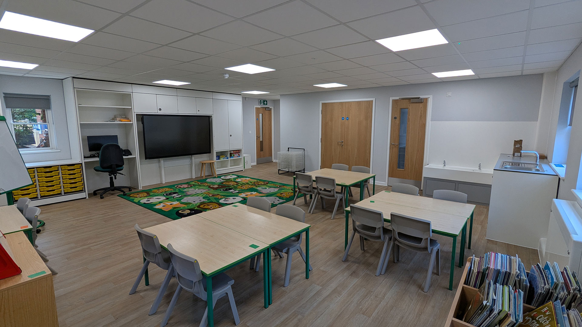 The classrooms were fully refurbished with new flooring, ceilings, lighting, activity sinks, noticeboards and blinds. The younger years classrooms all have new teaching walls with built-in storage, teachers desks and height-adjustable interactive whiteboards. The toilets were also upgraded with the heights of toilets and wash troughs set at lower levels to suit the age of the younger pupils.